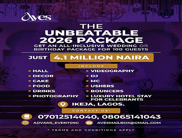 For just ₦4.1 million, the package includes hall, décor, cake, food, drinks, photography, videography, DJ, MC, ushers, bouncers, and a luxury hotel stay for the celebrants.