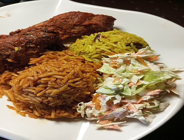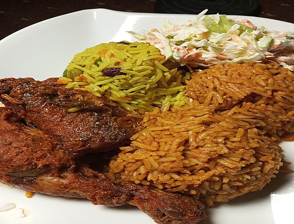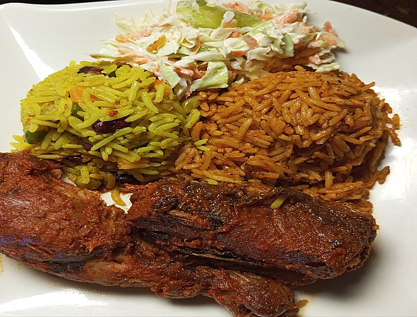 1 scoop of fried rice2 scoops of Jollof rice 2 protein A side dish (coleslaw or moinmoin)