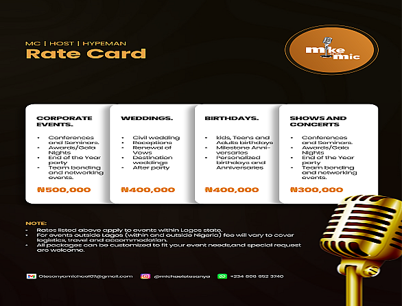 * For events outside Lagos (within and outside Nigeria) fee will vary to cover logistics, travel and accommodation.