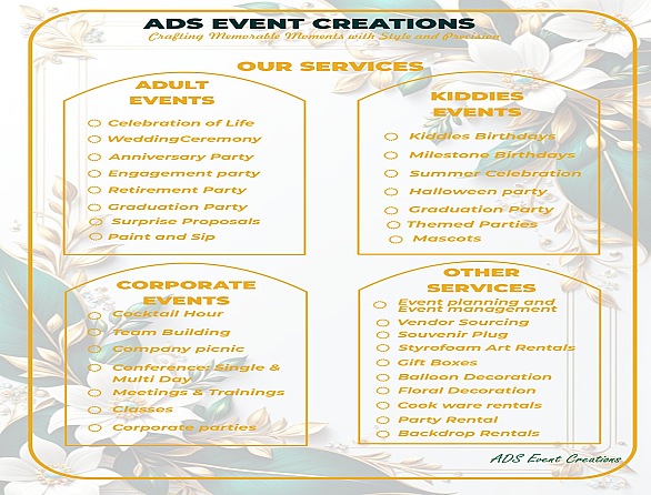 At ADS EVENT CREATIONS we turn your vision into reality with expert planning and elegant decor. Whether it is a corporate gathering, wedding, birthday, or special celebrations, we handle every detail with creativity, care and professionalism.