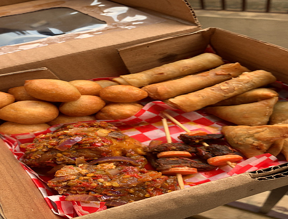 Assorted chops: spring rolls, samosas, puff-puffs, meatballs, gizzards, chicken bites, and kebabs
